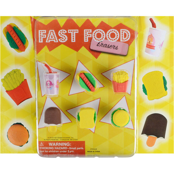 Love your fast food? Then these erasers are perfect additions to your pencil box or office! Some of the food featured in this mix include: hot dogs, hamburgers, soft drinks, French fries, and more. Collect all 7!