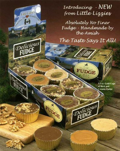 Filled to the top with rich and creamy Amish Fudge, these 3.5 oz. cups are individually wrapped in gold foil cups and packaged in an artistically designed, full color display box showing the beauty of the Amish Country where this delicious fudge is handmade. The appealing packaging along with the assortment of tasty fudge makes this an ideal gift for any fudge and chocolate lover.