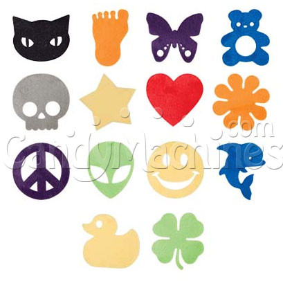 Furry stickers are true to their name. They are soft and fuzzy plus this mix includes 14 different designs. A cat, butterfly, skull, and peace sign are just a few. Stick them on notebooks, binders, and pencil boxes. These capsules vend in machines with a 1 inch wheel.