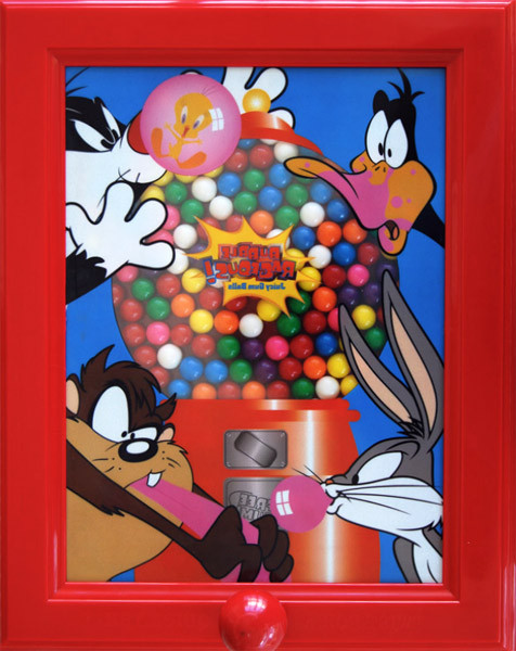 Tweety Bird, Daffy the Duck, Bugs Bunny and the Taz join Sylvester the Puddy Tat to adorn the classic gumball machine image in this exclusive Looney Toons Handy Candy Frame by Warner Bros. The frame is a bright cheery red measuring 15" tall by 12" wide. This picture frame is a real working candy dispenser, comes filled with junior sized gumballs and is refillable with your favorite small candies or gumballs. Just turn the knob at the bottom to dispense your treat.