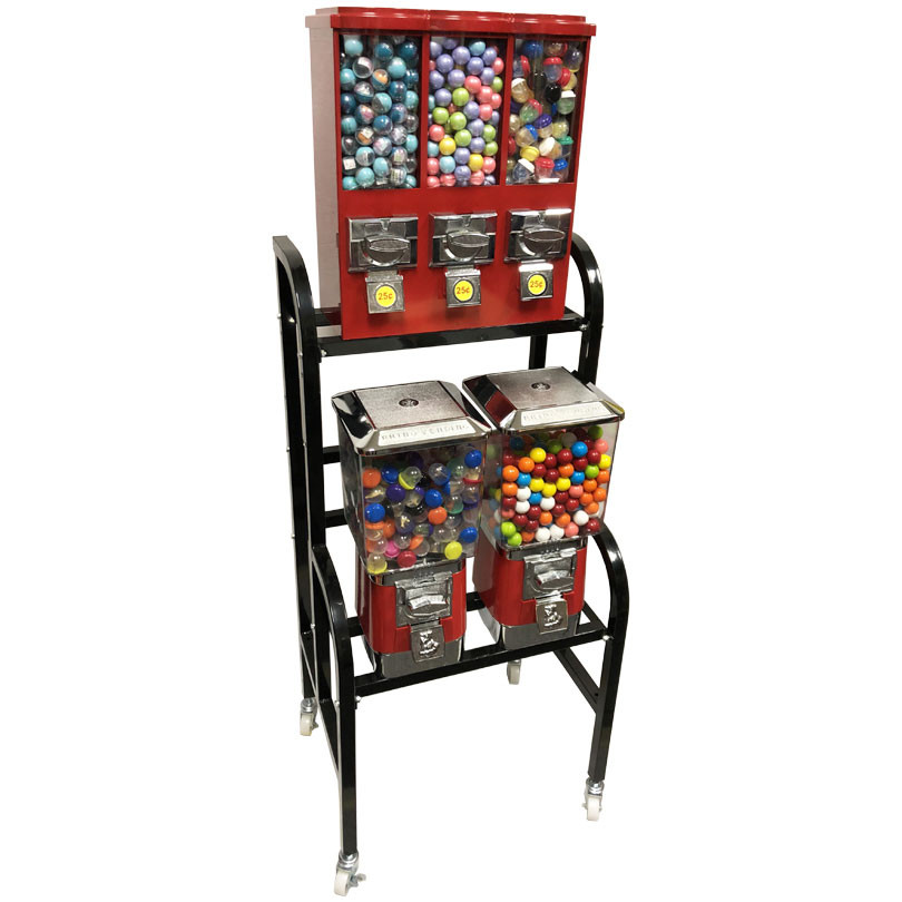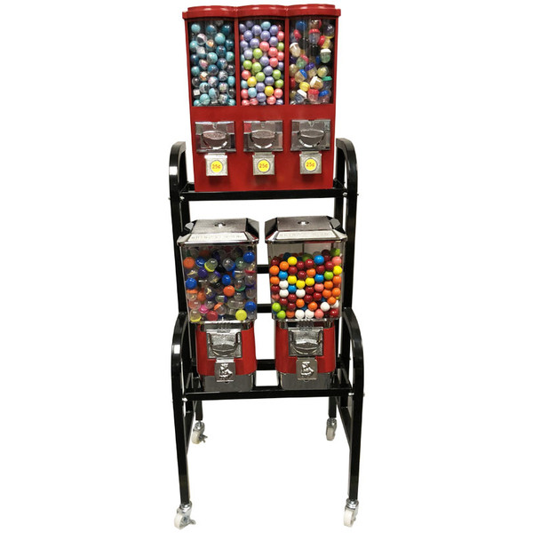 Great starter set-up for the beginner vending route operator being that it is self-contained and has a small footprint. It would make a great addition to any lobby or waiting room area. This rack features the Triple Time 3-in-1 vending machine and two Rhino Pro Bulk Vending Machines. The Triple Time machine is configured with 2 candy wheels (outside canisters) and 1 gumball wheel (middle cannister) while the Rhino Pro machines can be customized to dispense either gumballs or candy. This collection of machines comes with our heavy duty steel rack. Customers will appreciate the wide variety of treats and prizes while you enjoy making profits.