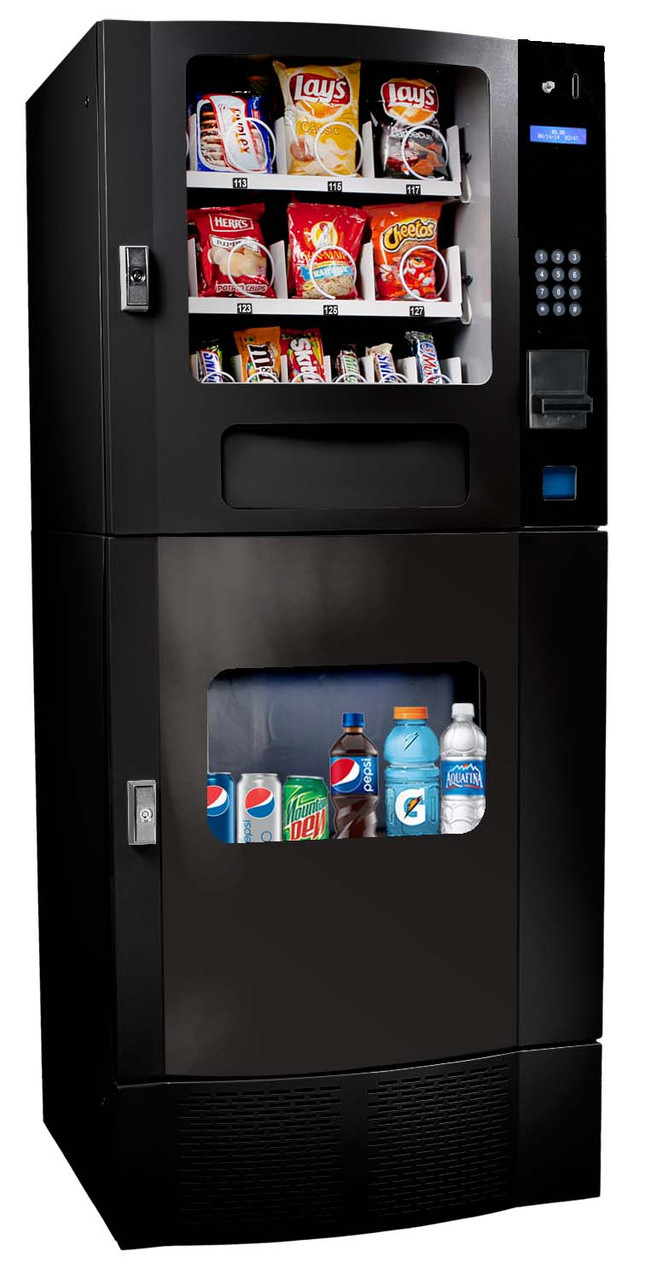 This machine has taken a snack vending machine and combined it with a soda vending machine, giving customers a greater variety at break time. The top two trays are designed to feature wider products such as chips and pastries, while the third tray allows you to offer 8 different selections of confectioneries such as candy bars. The bottom half of the machine dispenses cold beverages. It is set to vend 3 selections of 12 oz. cans and 2 selections of 16.9 oz. bottles and 2 selections 20 oz. bottles. The payment mechanisms are found on the right side of the upper half of the machine and the components are installed on a vertical slide-out shelf, designed for easy access.