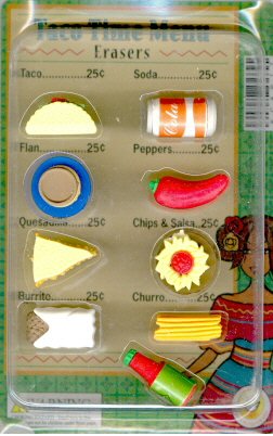 These erasers are shaped like Mexican food. There are 9 different kinds of snacks to collect. Each eraser comes ready to vend, packaged in 1-inch vending capsules for your convenience.