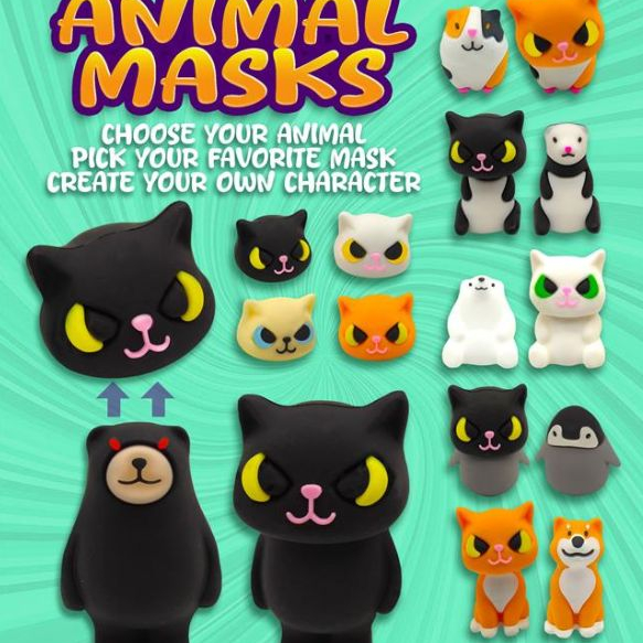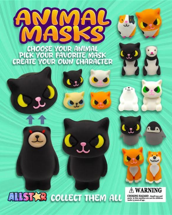 Introducing Animal Masks, the hilarious toys that are incredibly popular! The animals each come with the head of a cat in the capsule, that completely alters the appearance of the figurine. All the heads in the mix and all the bodies are interchangeable. Mix and match them and listen far and wide for the ensuing hilarity. Creative and filled with fun, these capsules toys are designed to dispense in machines with a 2" vending wheel.