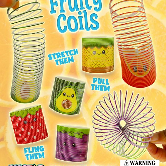 Introducing Fruity Coils, the collection of stretchy selections designed to teach that nutrition can be fun. The colorful, friendly emoji-style fruity faces attract the attention and the slinky action keeps it. Stretchy and fun, you can also fling them. Creative and entertaining, these capsuled Fruity Coils toys are designed to dispense in machines with a 2" vending wheel.