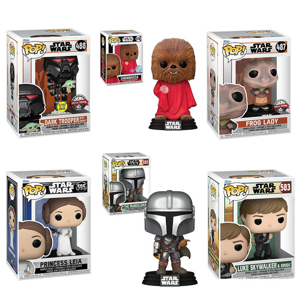 Includes The Mandalorian, Luke Skywalker & Grogu duo, Chewbacca, Dark Trooper & Grogu, Princess Leia, and Frog Lady