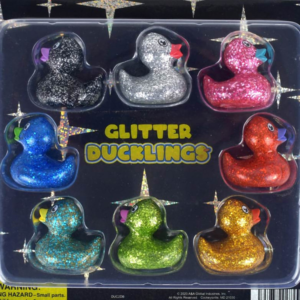 This collection of festive rubber ducklings all have the same endearing expression and a distinctly glittery exterior. Glitter colors include red, orange-yellow, grean, teal, blue, silver, black and pink. Collect them all!
