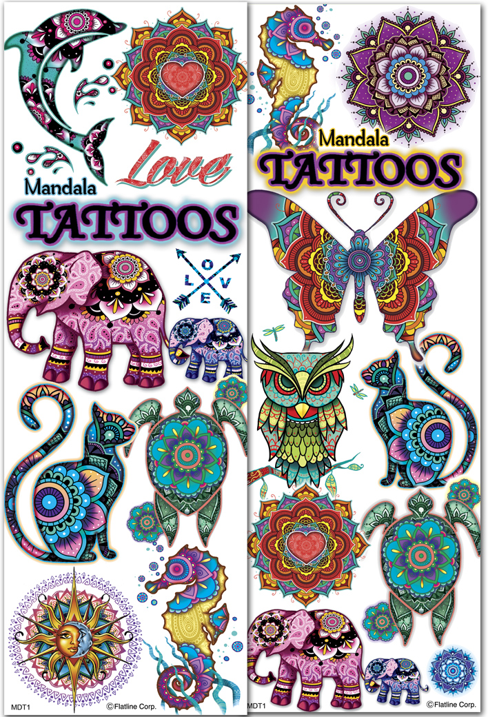 Mandala Tattoos feature a collection of highly decorative, colorful temporary tattoos depicting love, dolphins, elephants, turtle, owl, cat and more. It's not specified how many different designs are in the mix, but the display card shows most of them. Each tattoo is easy to apply, with water, and easy to remove. Collect them all!