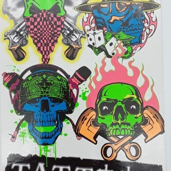 This series of temporary tattoos is one that both, guys and gals, will enjoy. Each tattoo features a unique, highly artistic design with neon colors. There are approximately 6 designs in the mix.