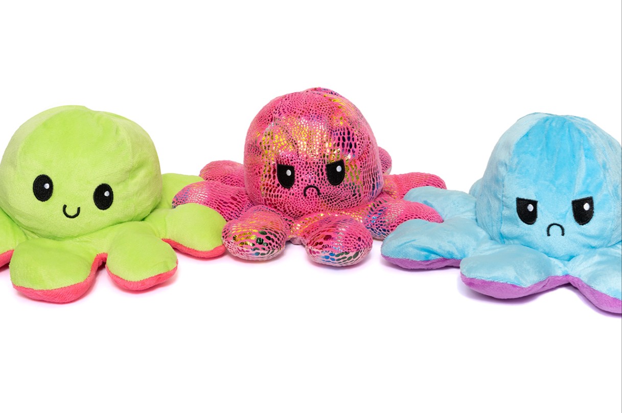 A fan-favorite reversible octopus plush assortment featuring bold colors, tie-dye patterns, and shiny fabrics that flip between happy and grumpy moods.