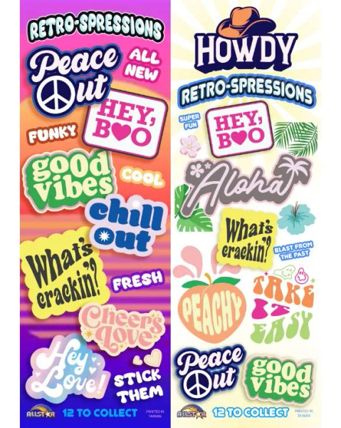 Nostalgic Flair: Introducing RetroSpressions Stickers, a throwback to the classic phrases that have charmed generations! This assortment invites customers to relive the good old days with 12 unique expressions, including "Peace Out," "Good Vibes," and "What's Crackin'?" among others.