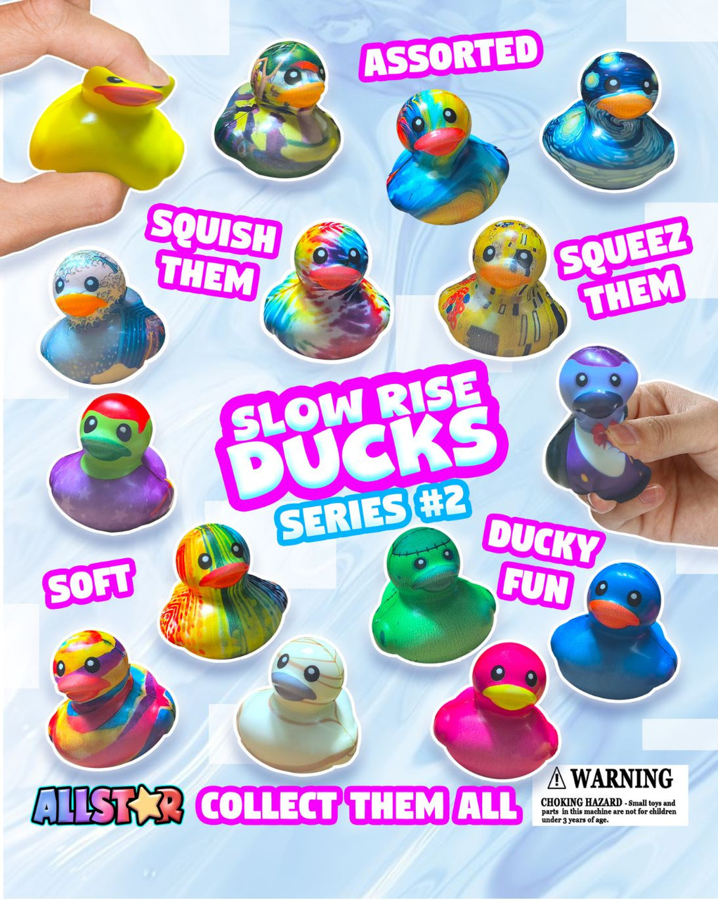 - Squish and Squeeze: Slow Rise Ducks occur in many iterations, including near-solid colors as well as vivid kaledoscopic colors. Most sport a hat of some sort. They're visually appealing and sure to catch the eye of anyone walking by your vending machine.