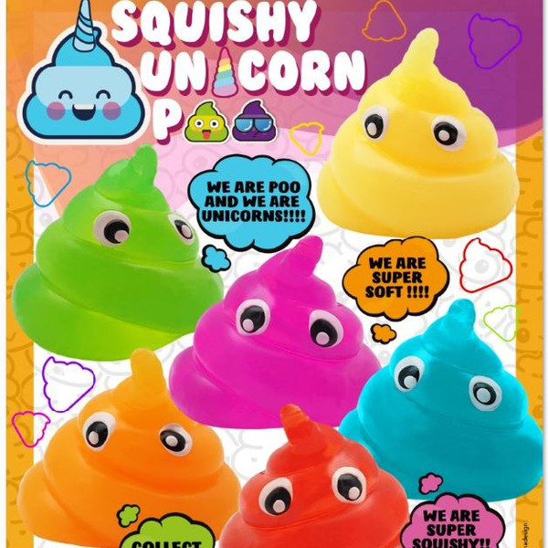Squishy Unicorn Poop glorifies the emoji pile of poo with glitter and pastel colors, ostensibly rendering it poop of unicorn. Enjoy the fascinating juxtaposition of ideas. There are 250 toys per case. Try and collect them all!