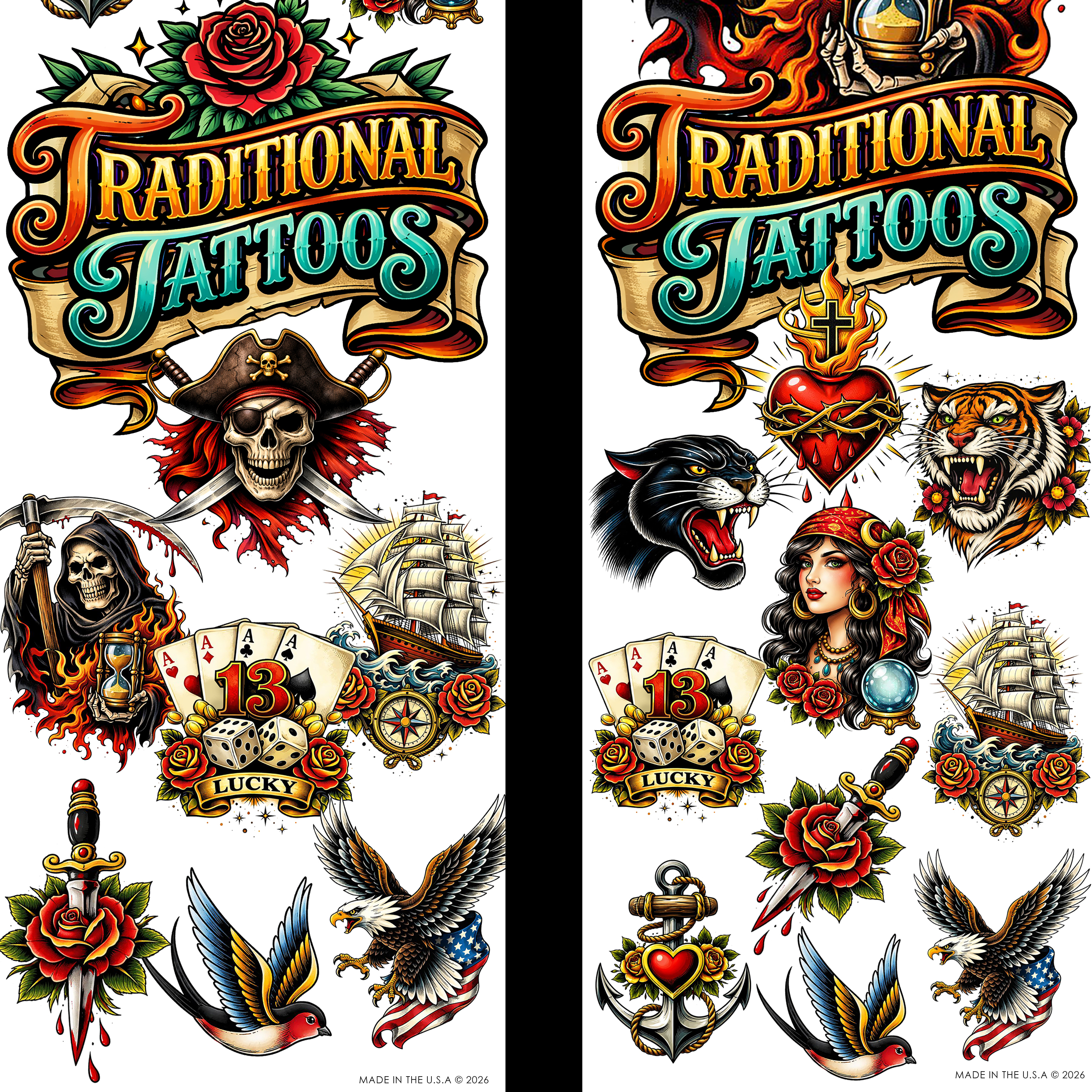 Overall, these made-in-the-USA tattoos feature the vivid black and red contrasts that show up nicely on skin. Add them today to your tattoo lineup for some wildly traditional turnover sales out of your flat-vend machine.