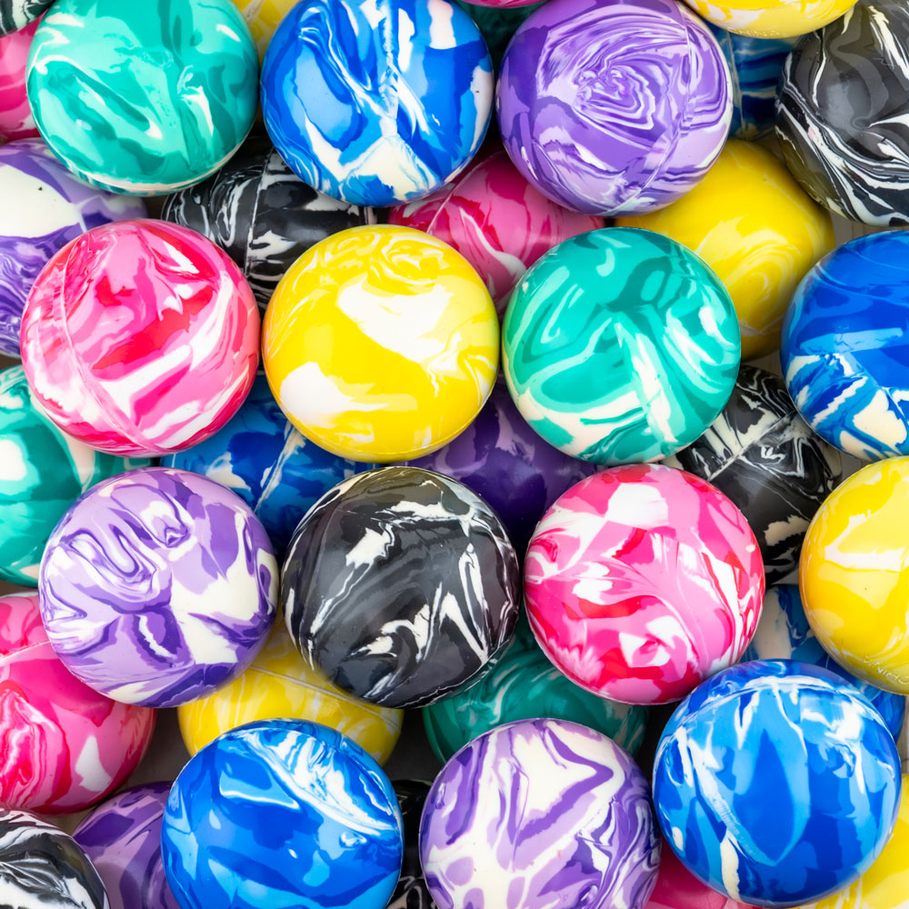 These 49mm bouncy balls come in six different colors swirled with white.