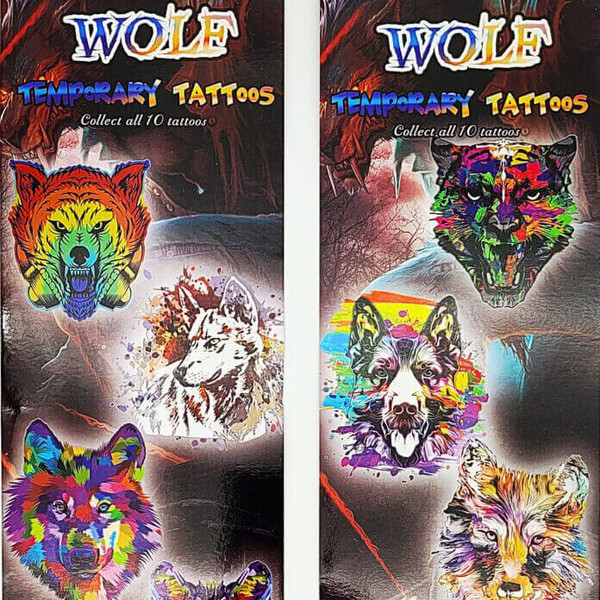 This second series of temporary tattoos depicts all kinds of magestic wolf heads in attractively artistic formulations. There are 10 designs in the mix.