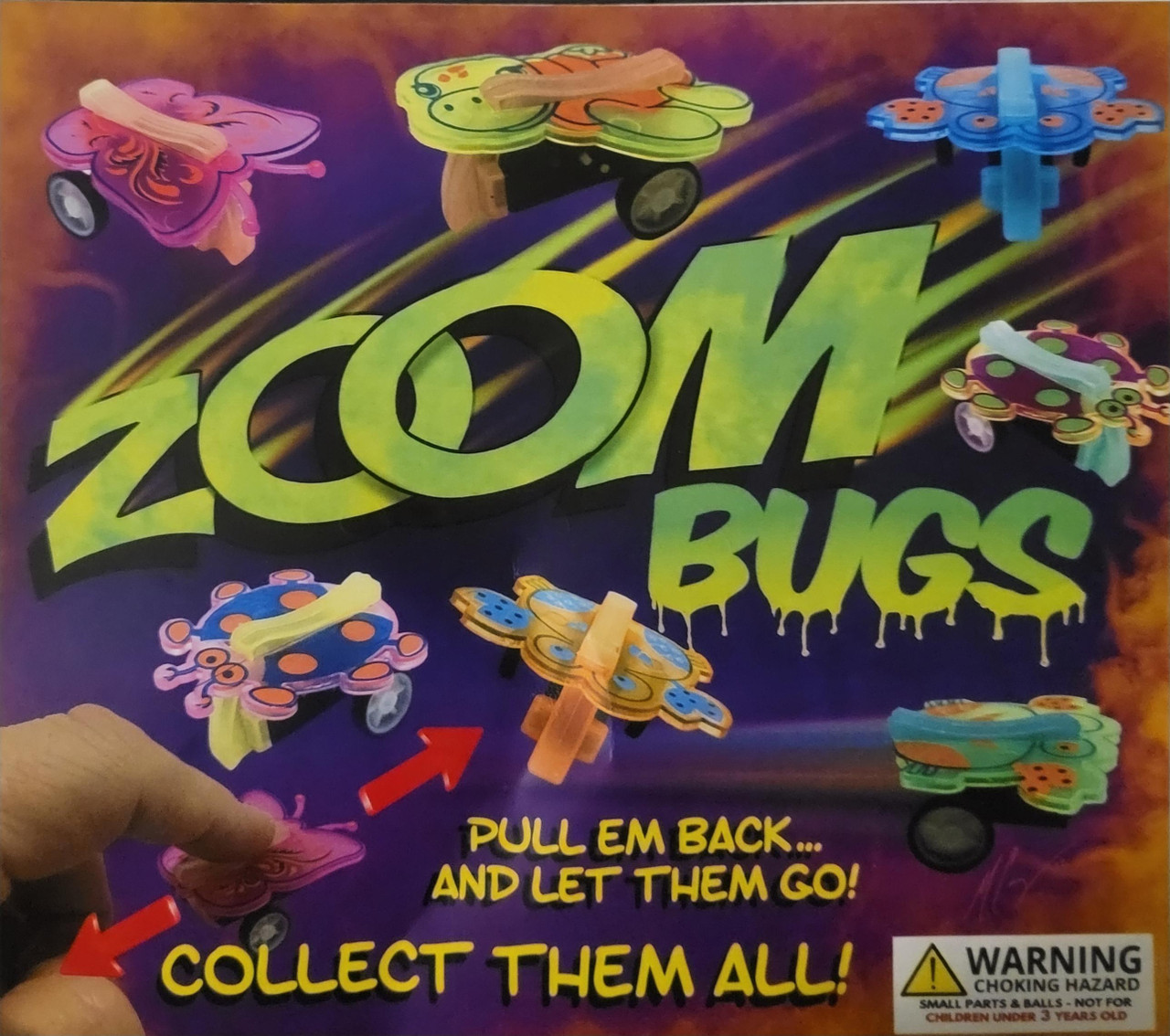This collection features colorful flat insects with wheels that are springloaded. Pull them back and let them go!